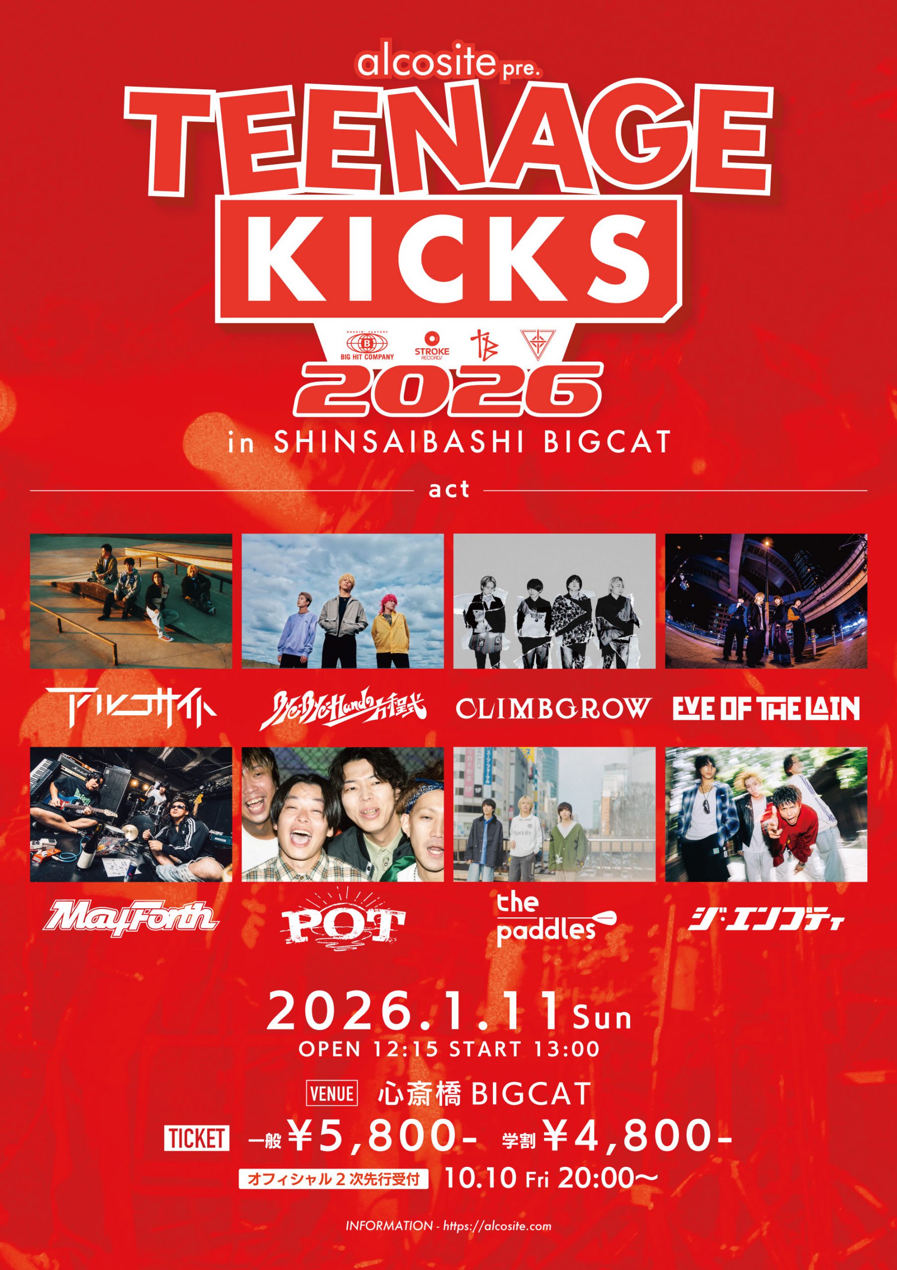 アルコサイト主催イベント「TEENAGE KICKS 2026」全出演者一挙発表、 Bye-Bye-Handの方程式、climbgrow、POTなど決定!!