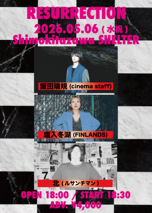 5/6下北沢SHELTERにて、弾き語りイベント『RESURRECTION』開催。飯田(cinema staff)、塩入(FINLANDS) 、北(ルサンチマン)が出演。